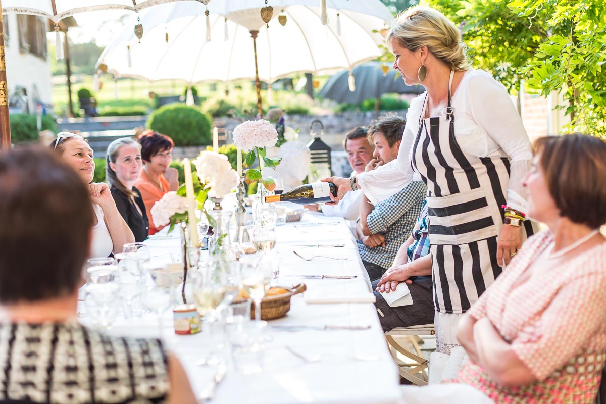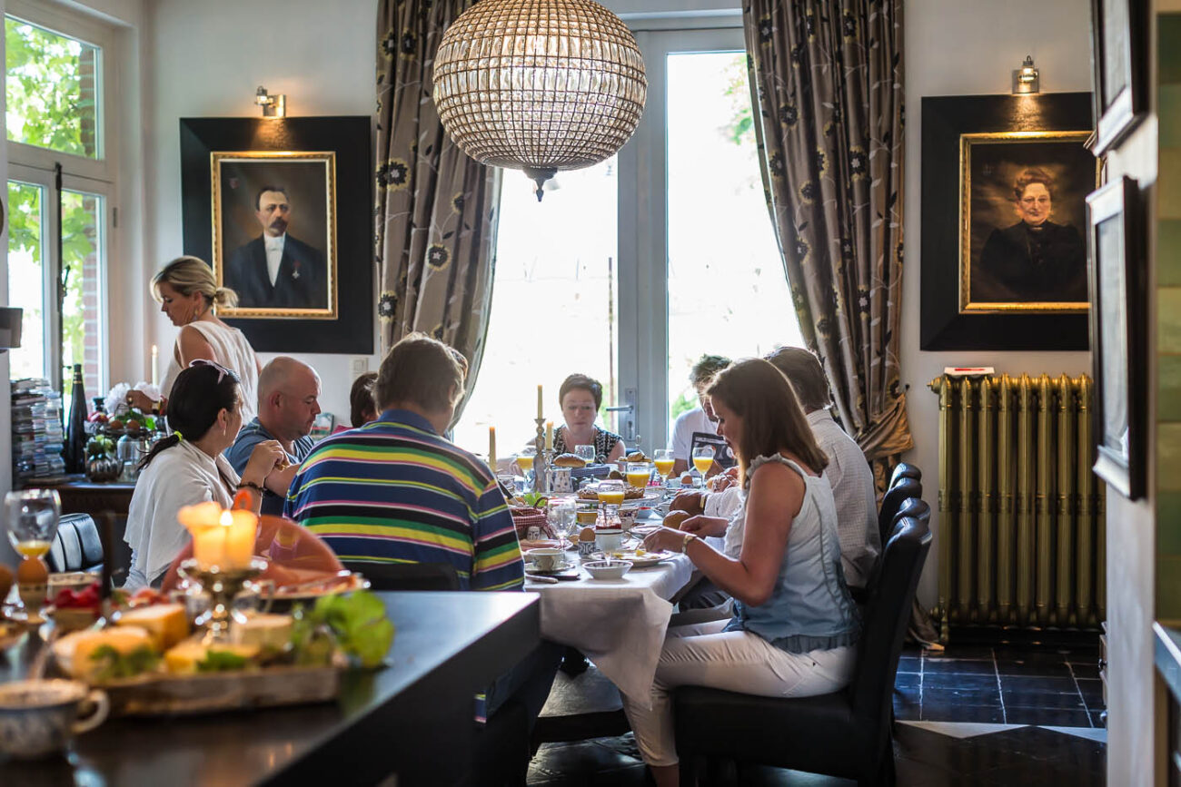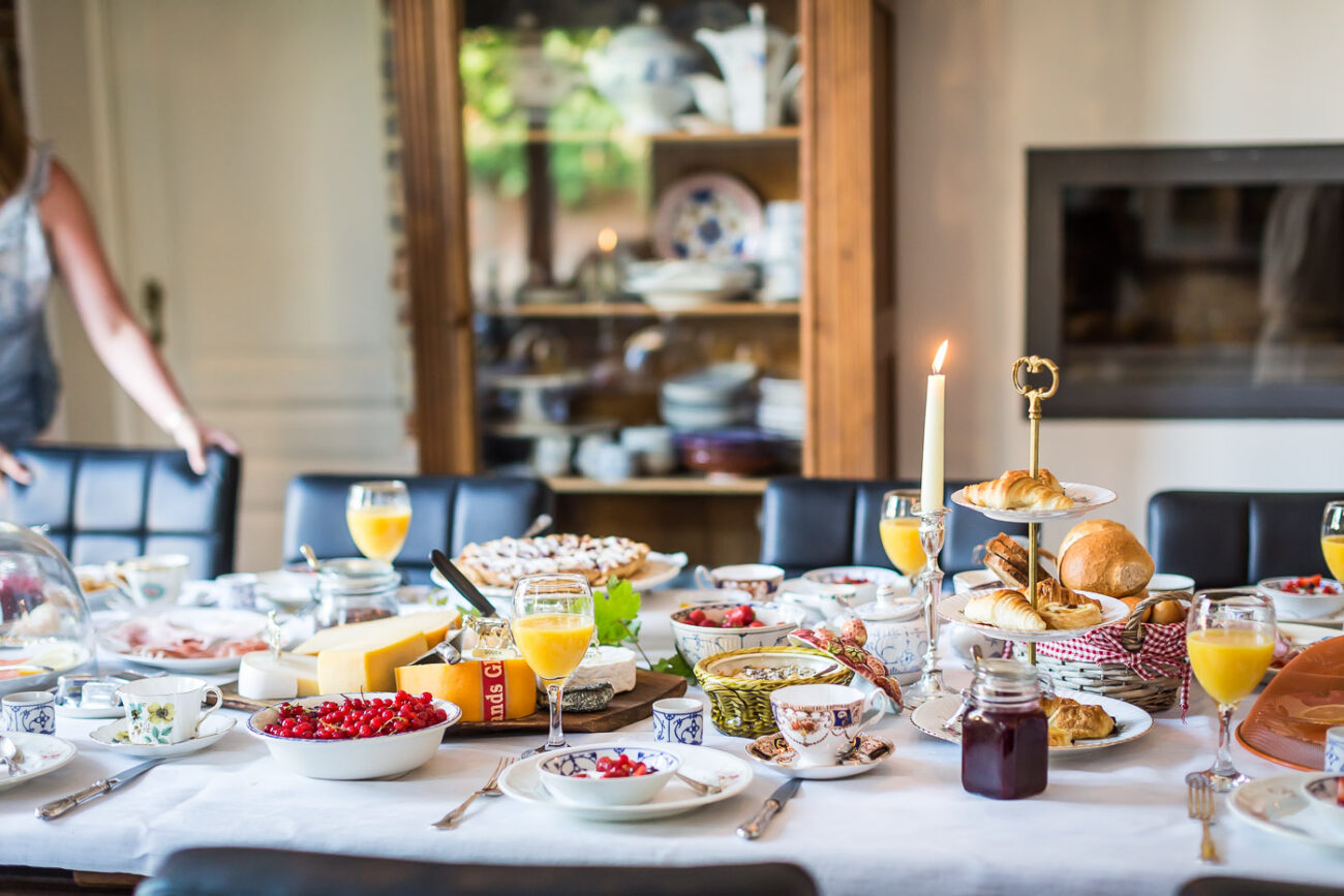 ’s Morgens wordt de ontbijttafel gedekt met vers gebakken brood, croissants en pistolets, roomboter, lokale kazen, hespen, zelfgemaakte confituren en een heerlijk gebakken of gekookt eitje van onze buurkippetjes.